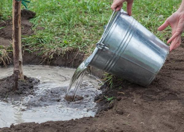 Засыпаем яму и слегка трамбуем поверхность, не травмируя ствол. Обильно поливаем.